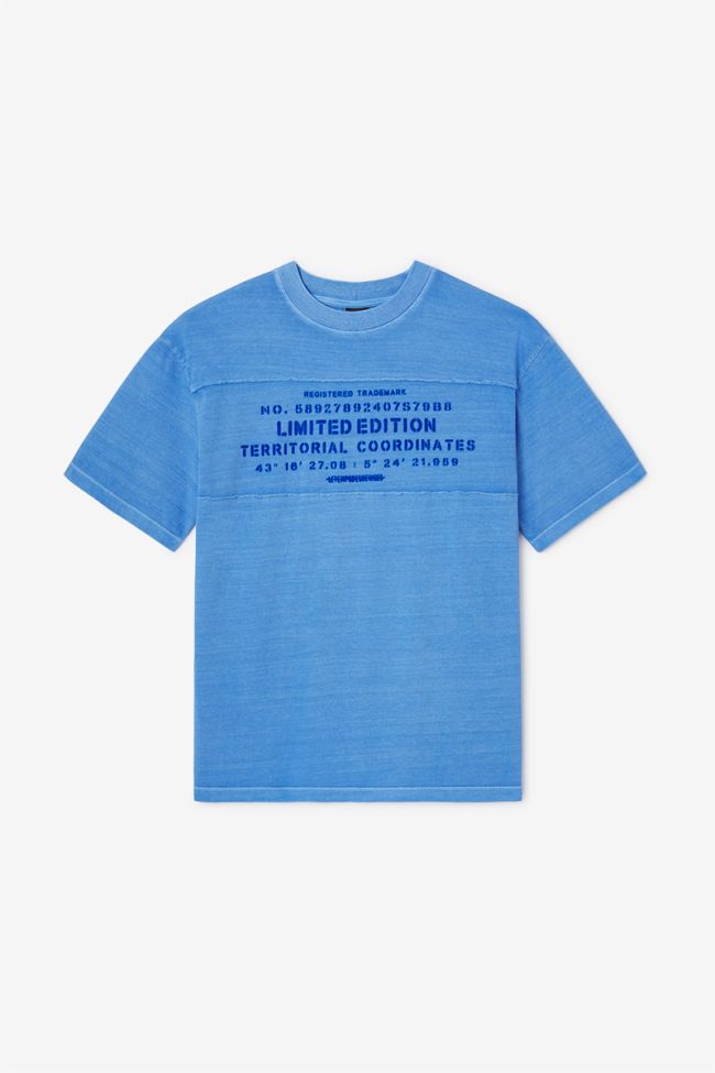 T-shirt bleu à inscription personnalisée en relief effet velours.