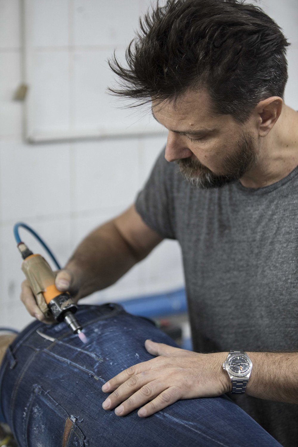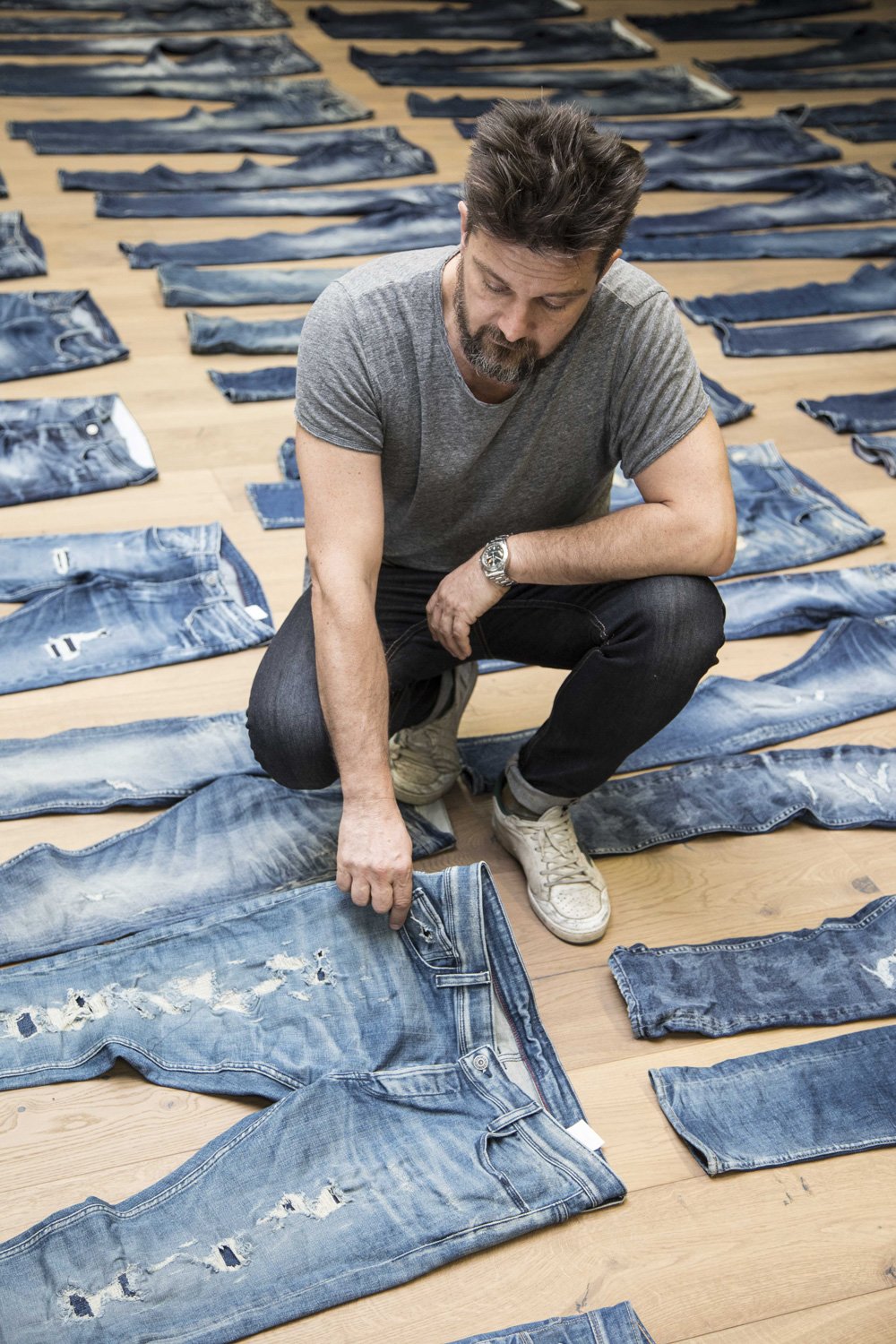 Encore aujourd’hui, je suis souvent dans les usines auprès des ouvriers pour élaborer de nouveaux procédés. Nous dosons, nous testons, nous essayons et c’est ainsi que, depuis le lancement de la marque, nous avons su développer nos propres recettes. Tels des alchimistes, nous avons mis au point des délavages propres à nos marques et nous déclinons à l’infini toutes les possibilités que la toile bleue nous offre. C’est pour cela que nous sommes devenus les spécialistes du jeans vintage.