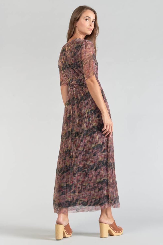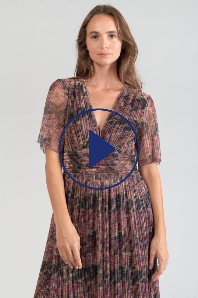 Cette robe longue Amiel est idéale pour vos soirées habillées avec son tissu plissé à l'imprimé original irisé, sa taille drapée pour mettre en valeur la poitrine, ses manches courtes transparentes et son col en V très féminin. Pour plus de confort, une fermeture zippée invisible sur le côté, un crochet pour ajuster l'ouverture du col et une doublure sur toute la longueur.