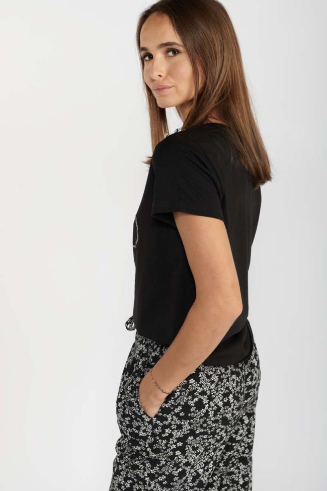Ce t-shirt Aneka noir vous donnera un look casual avec son imprimé personnalisé "Le Temps des Cerises" à motif léopard noir et blanc ainsi que ses trois boutons décoratifs argentés au niveau de l'épaule gauche.