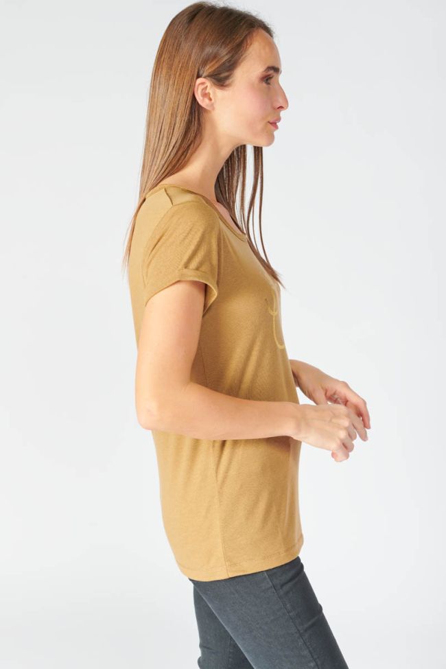 Ce t-shirt Basitrame caramel avec son logo "Le Temps des Cerises" doré, ses surpiqûres irisées et ses manches courtes à revers est un basique féminin à avoir dans son armoire !