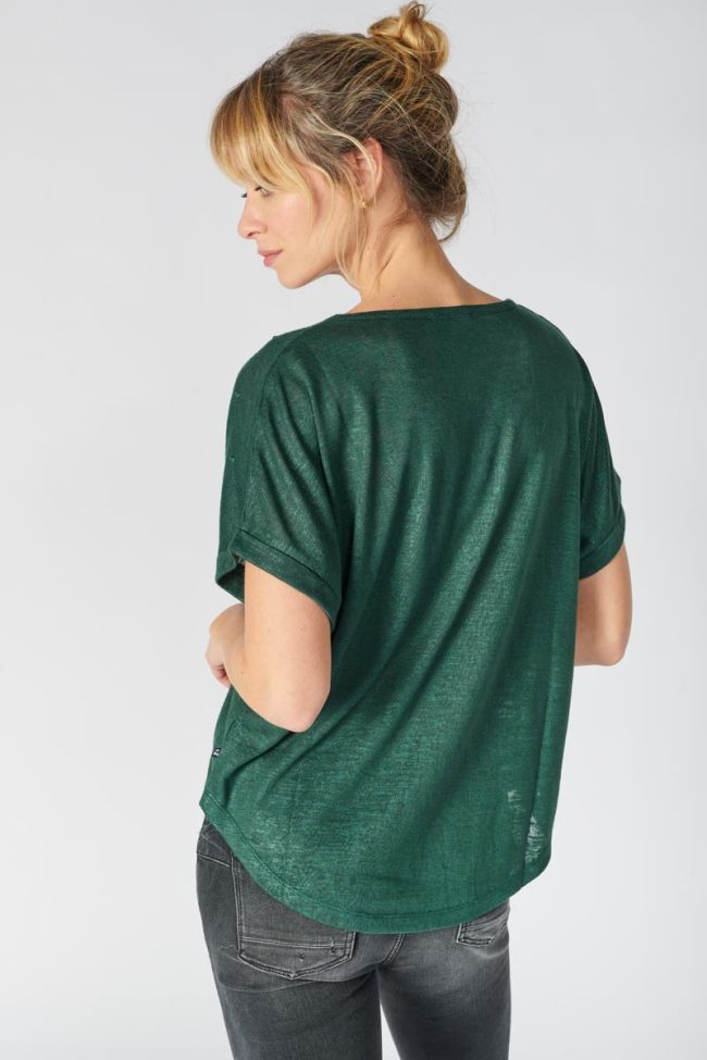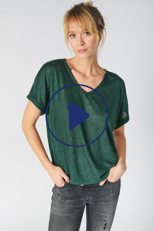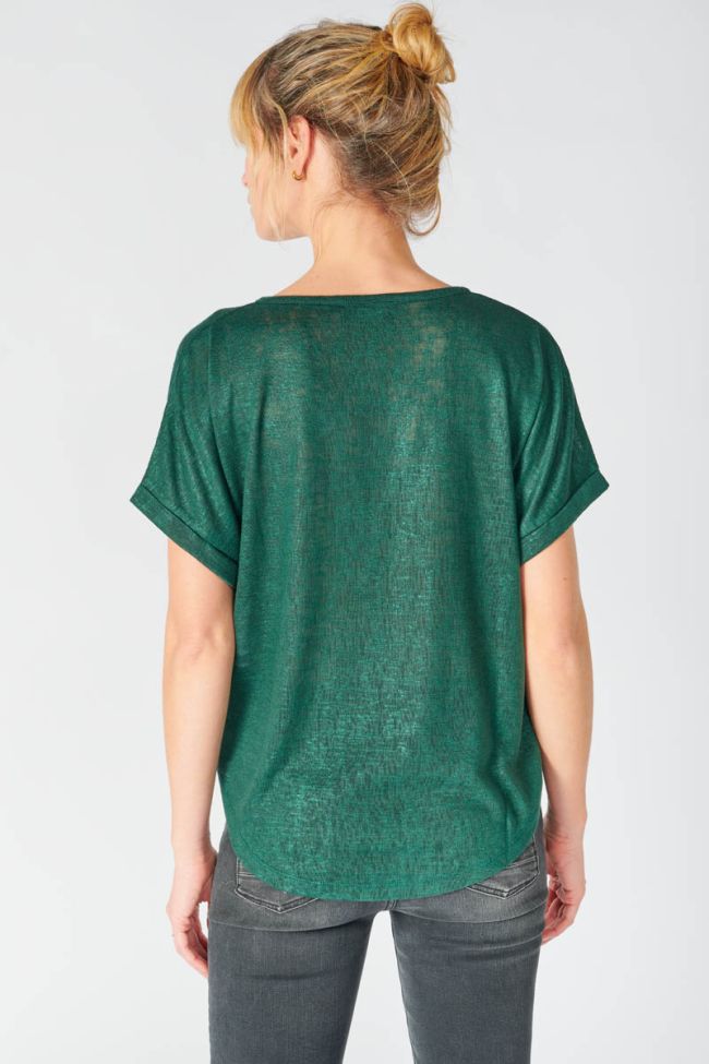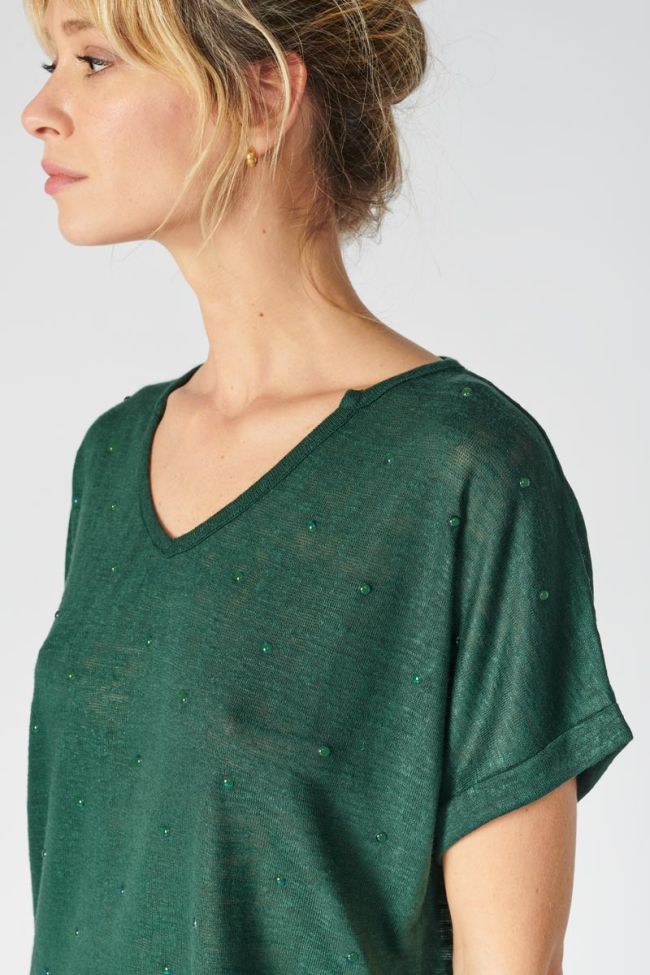 Ce t-shirt Bijou vert sapin a un style casual avec ses revers cousus, sa forme loose et sa matière légère mais est pour autant féminin grâce à son tissu parsemé de fils brillants ton sur ton et ses applications sous forme de perles vertes.