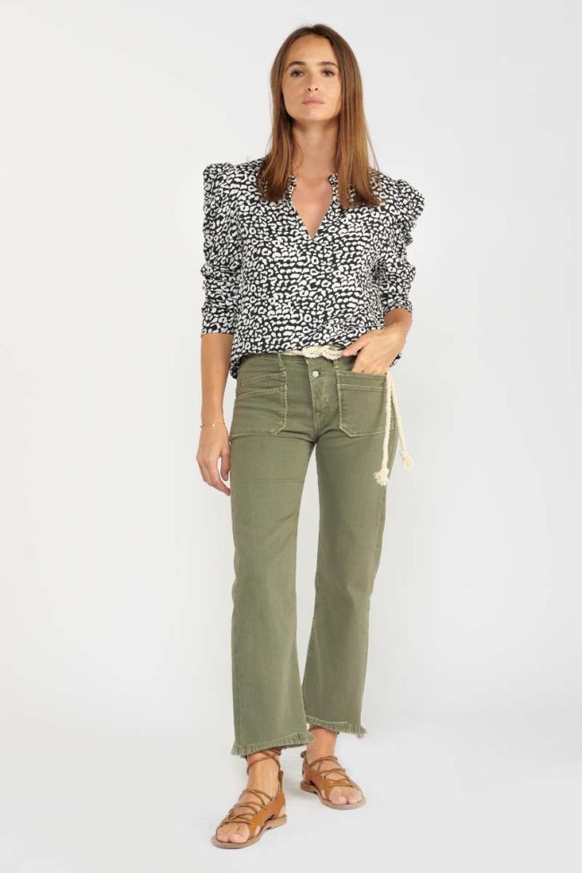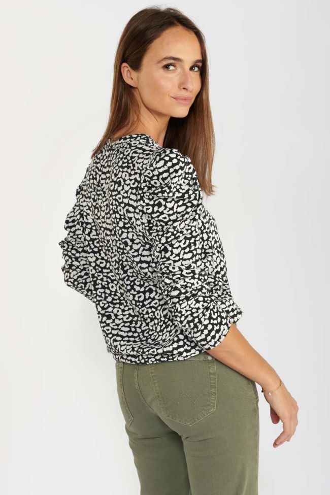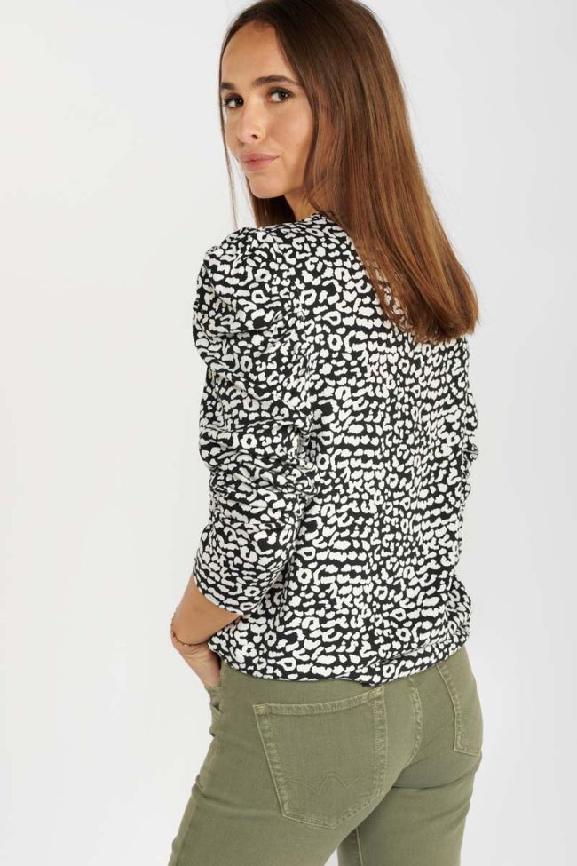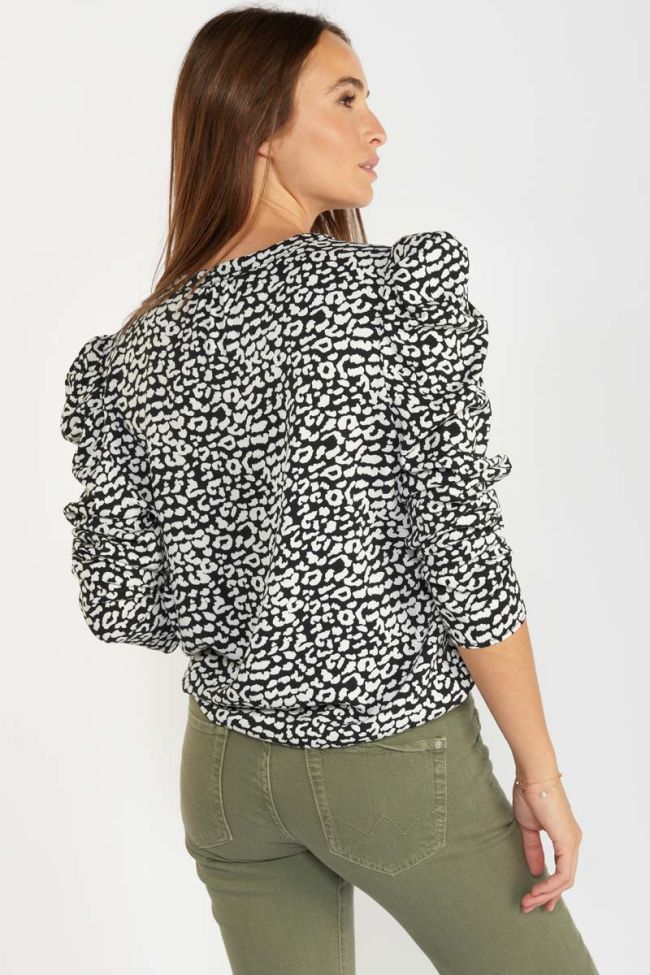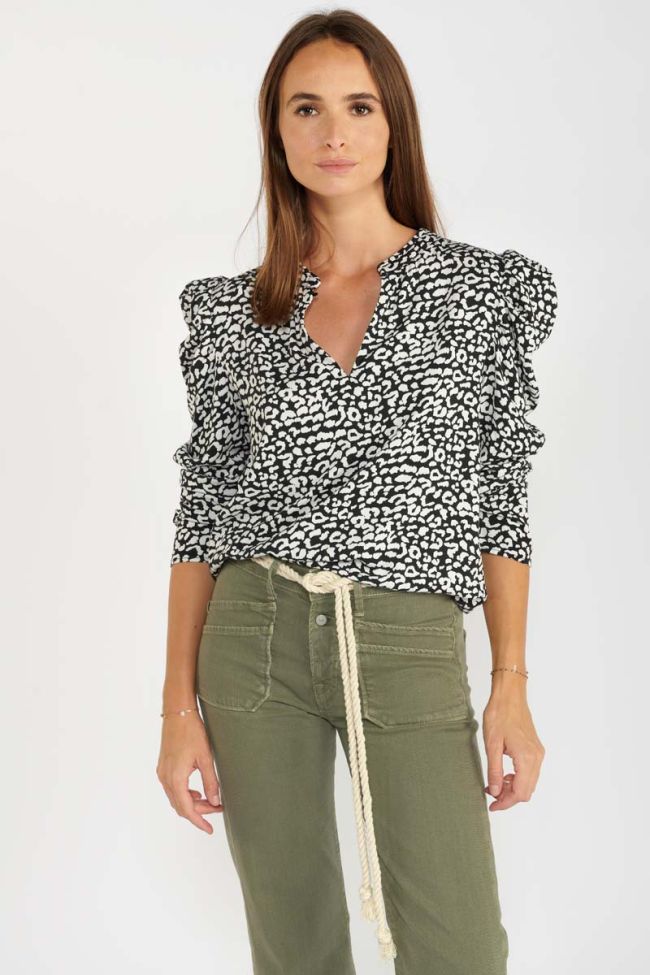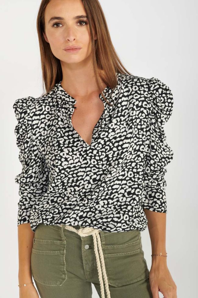 Cette blouse Chama est très élégante et féminine avec son motif léopard noir et blanc, ses manches bouffantes au niveau des épaules et son col en V.