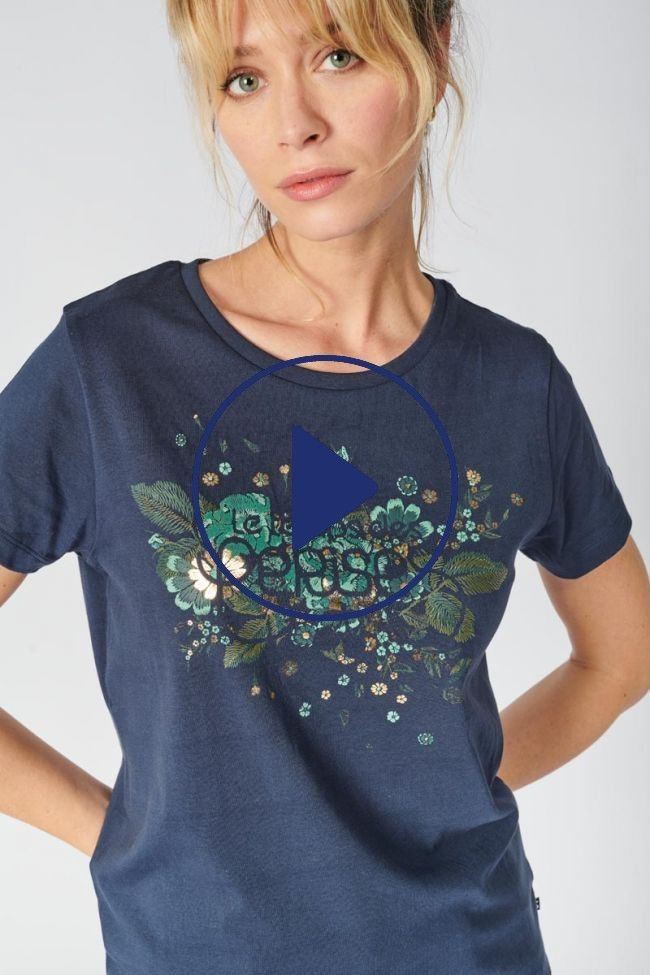 Ce t-shirt Frankie bleu marine est très tendance grâce à son imprimé, personnalisé "Le Temps des Cerises", à motif feuilles vert avec des touches dorées.