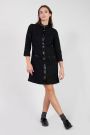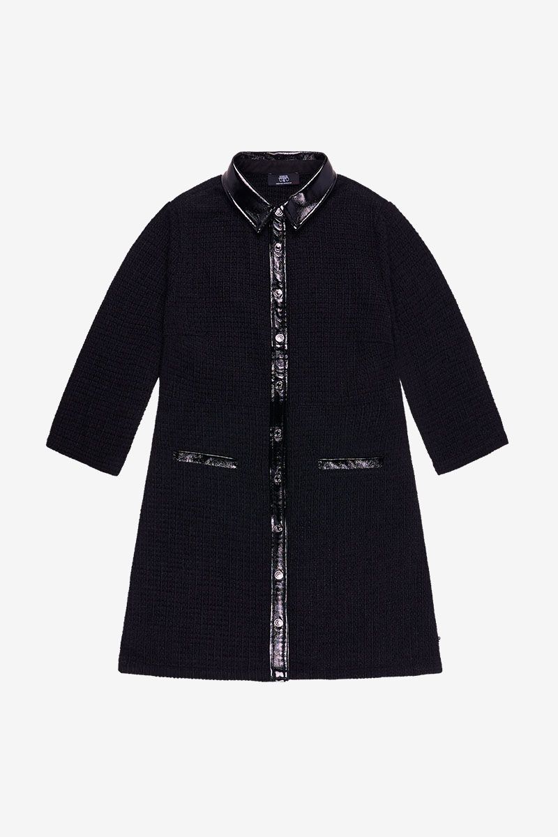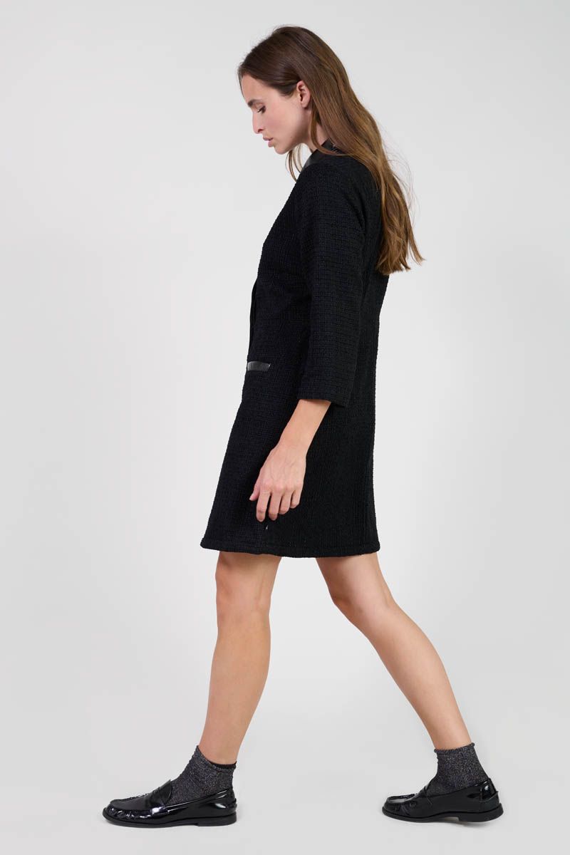 Cette robe Jaya noire est votre alliée mode avec son col et sa patte de boutonnage en vinyle, sa matière effet tweed et sa coupe droite. Pour le détail, des fils brillants habillent la pièce.