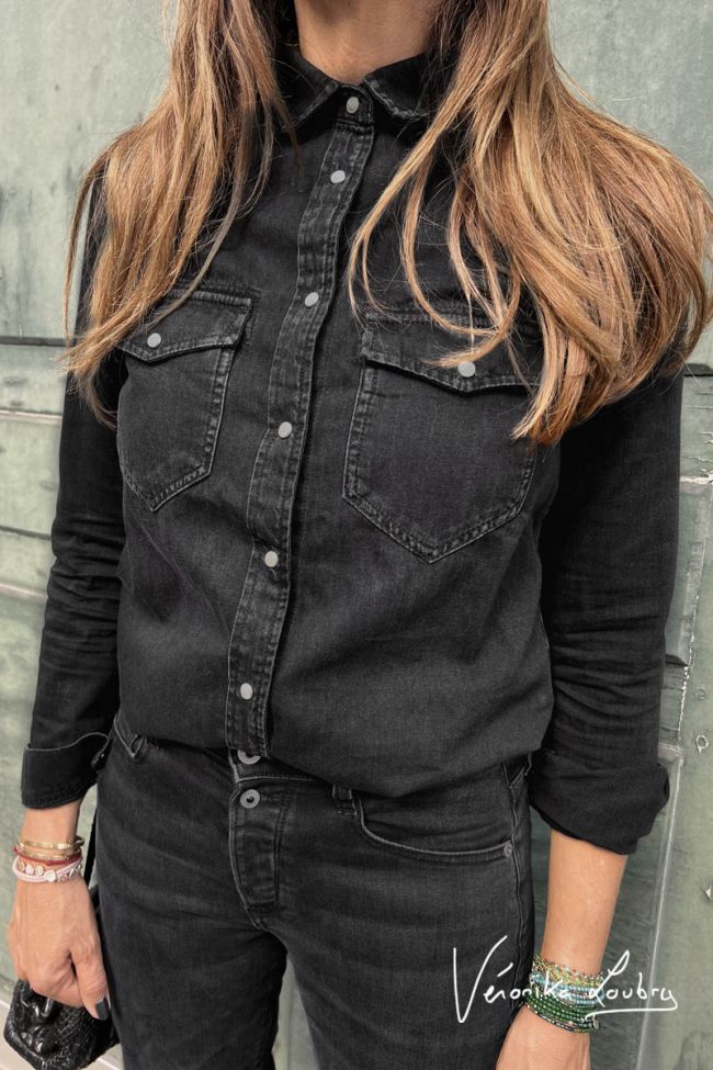 Cette incontournable chemise en jeans noir Josy a un look casual grâce à sa coupe, tout en étant féminine avec ses boutons ornés de pierres blanches à la fermeture, aux poches poitrines et aux poignets. Son délavage apporte le côté décontracté et tendance à la pièce.