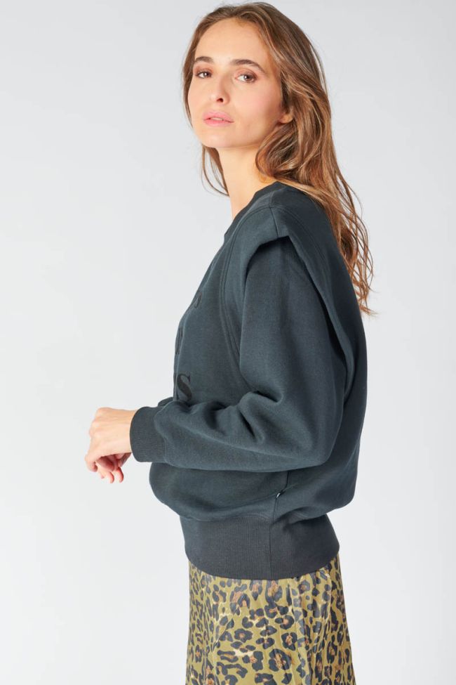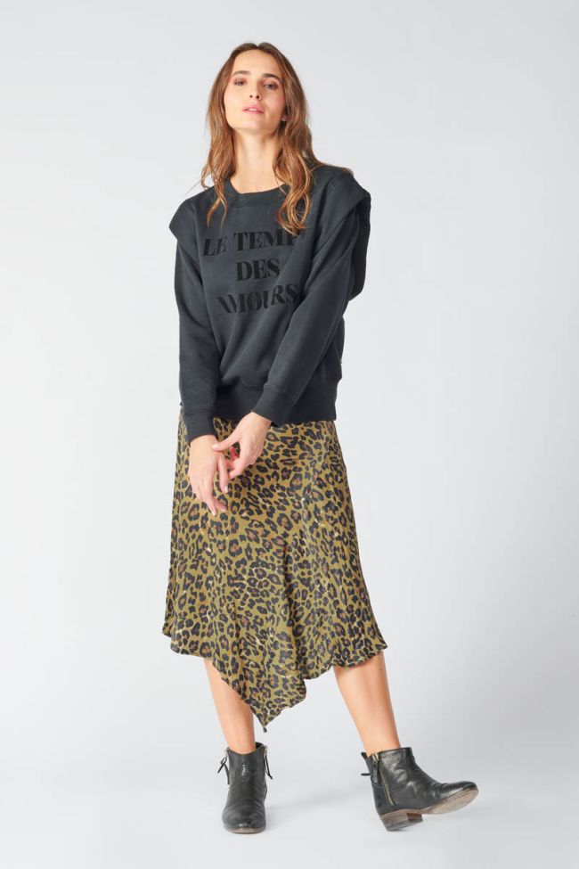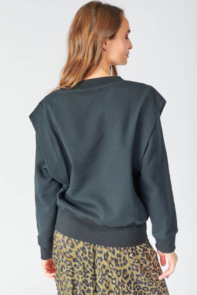 Ce sweat Kilima noir allie féminité et tendance à la perfection avec ses plis au niveau des manches qui donnent un effet épaulette et son imprimé noir.