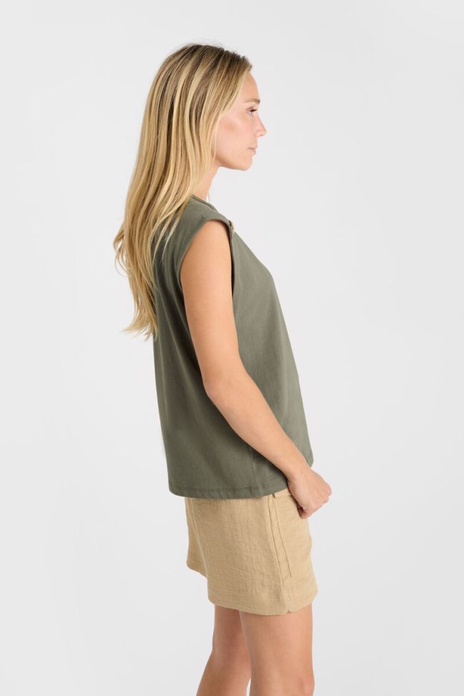 T-shirt kaki sans manches avec applications métalliques dorées sur les épaules.