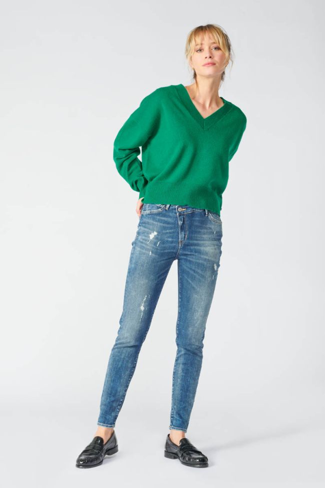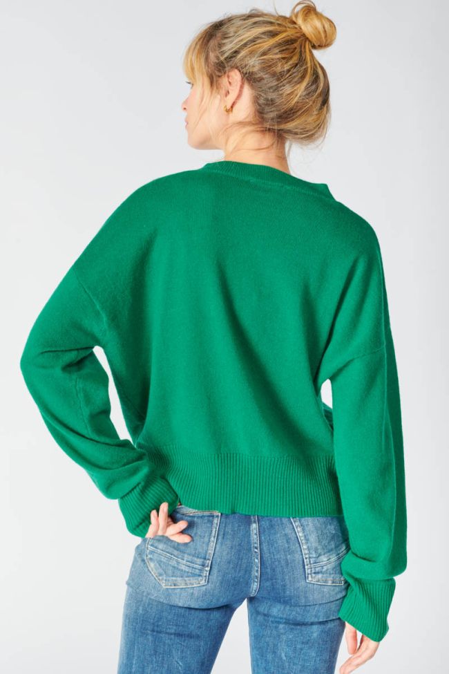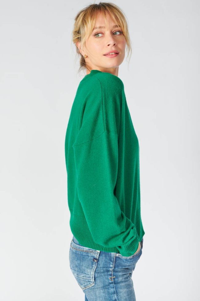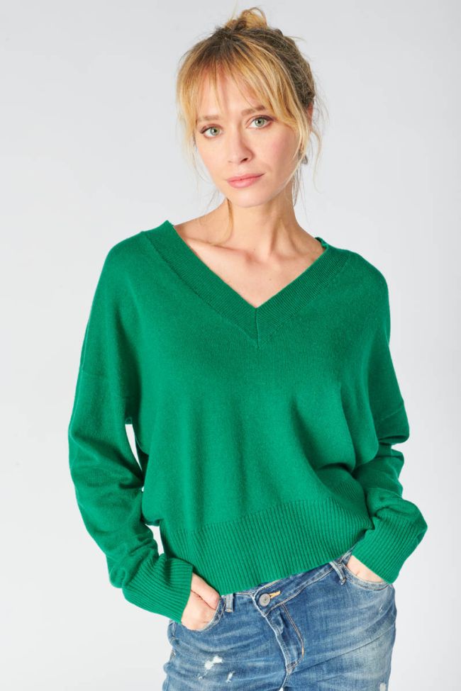 Ce pull à col V Martie couleur vert sapin a une matière en cachemire mélangé très douce et agréable à porter, avec sa coupe loose et ses bords côtes sur les poignets. Il donne un style casual et cocooning.