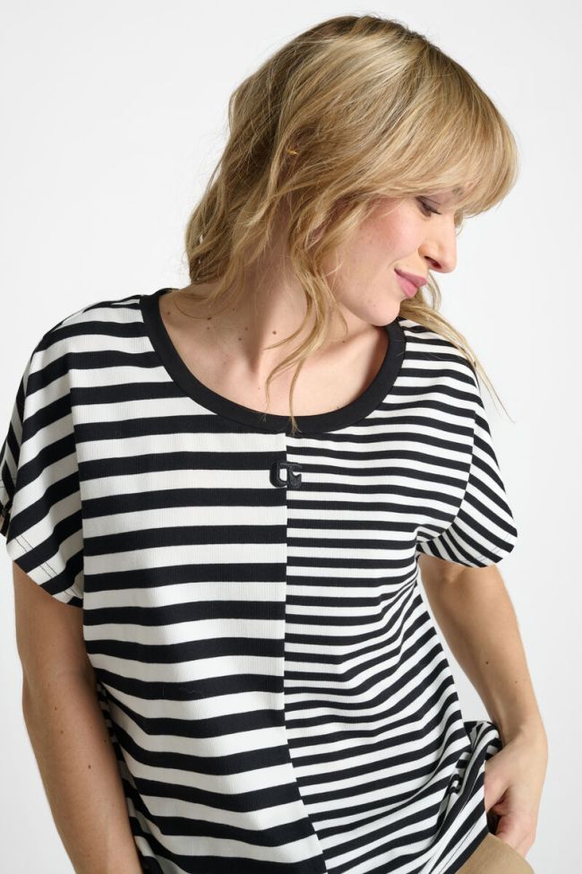 T-shirt à rayures noires et banches, monogramme noir en relief.