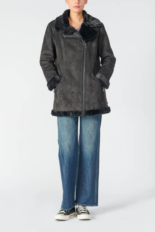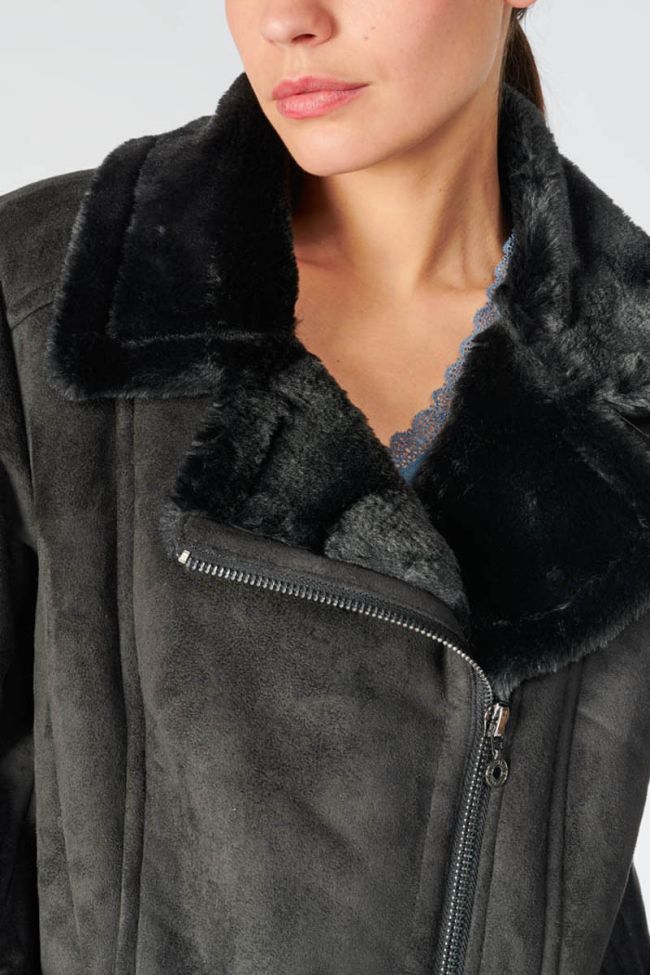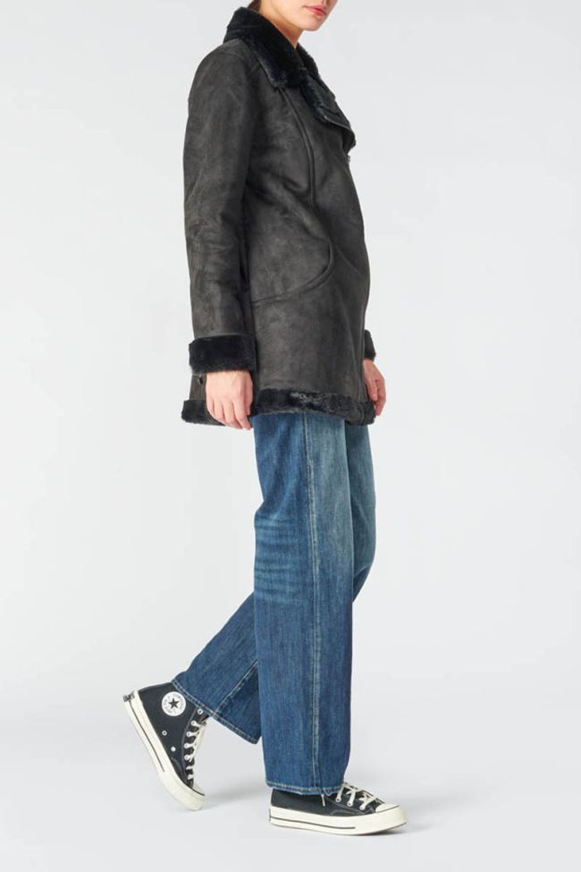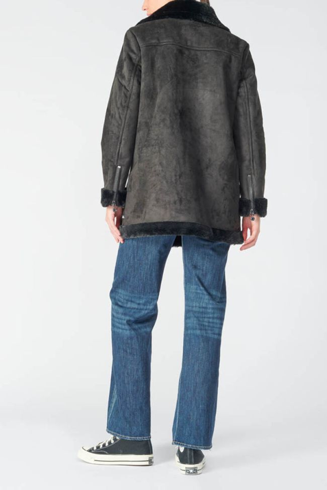 Ce manteau Orcha noir à la fermeture asymétrique s'adapte à tous les styles avec sa matière douce doublée avec de la fausse fourrure lisse, son col tailleur et ses poches incrustées dans les coutures. Pour plus de féminité, la fermeture zippée est argentée et personnalisée LTC tout comme les poignets habillés de fermetures zippées.