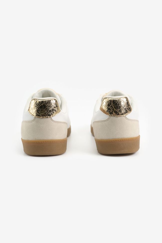 Baskets blanches au monogramme doré.