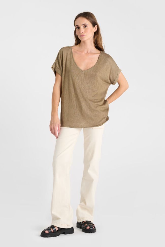 T-shirt marron col V aux manches courtes et à l'effet discret brillant.