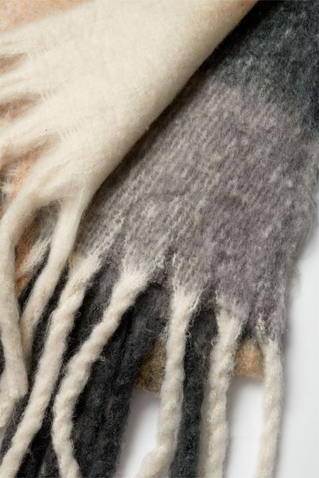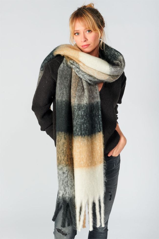 Cette écharpe Rhin vous aidera à vaincre le froid avec sa matière douce et chaude, tout en gardant un look tendance avec ses gros carreaux dans les tons de beige et noir ainsi que ses franges à chaque extrémité.