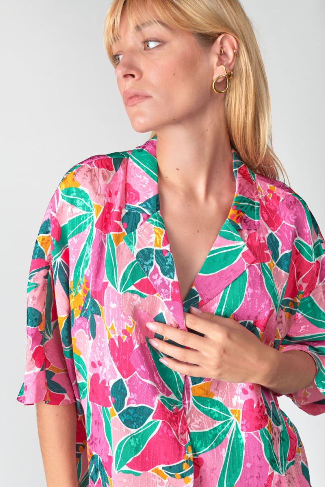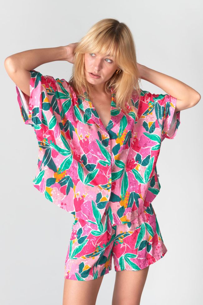 Cette chemise Sauge à manches courtes est très tendance avec son imprimé fantaisie très coloré parsemé de fils brillants. Son toucher soyeux apporte du confort à la pièce.