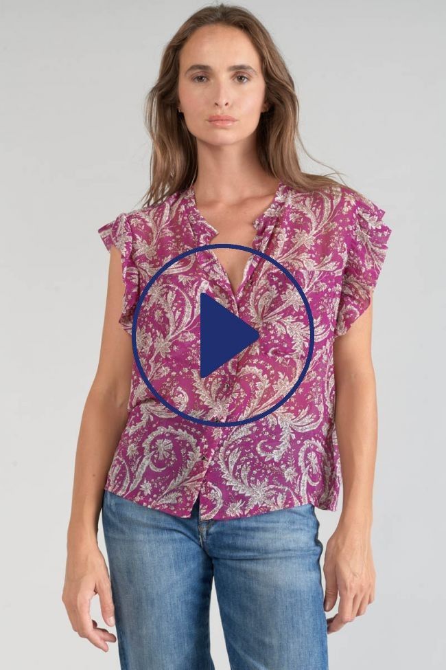 Cette blouse Suri est très féminine avec son motif cachemire blanc sur fond violine, ses volants au niveau des épaules et son tissu en voile légèrement transparent idéal pour la saison estivale. Les deux poches poitrine carrées et les boutons argentés apportent du style à la pièce.