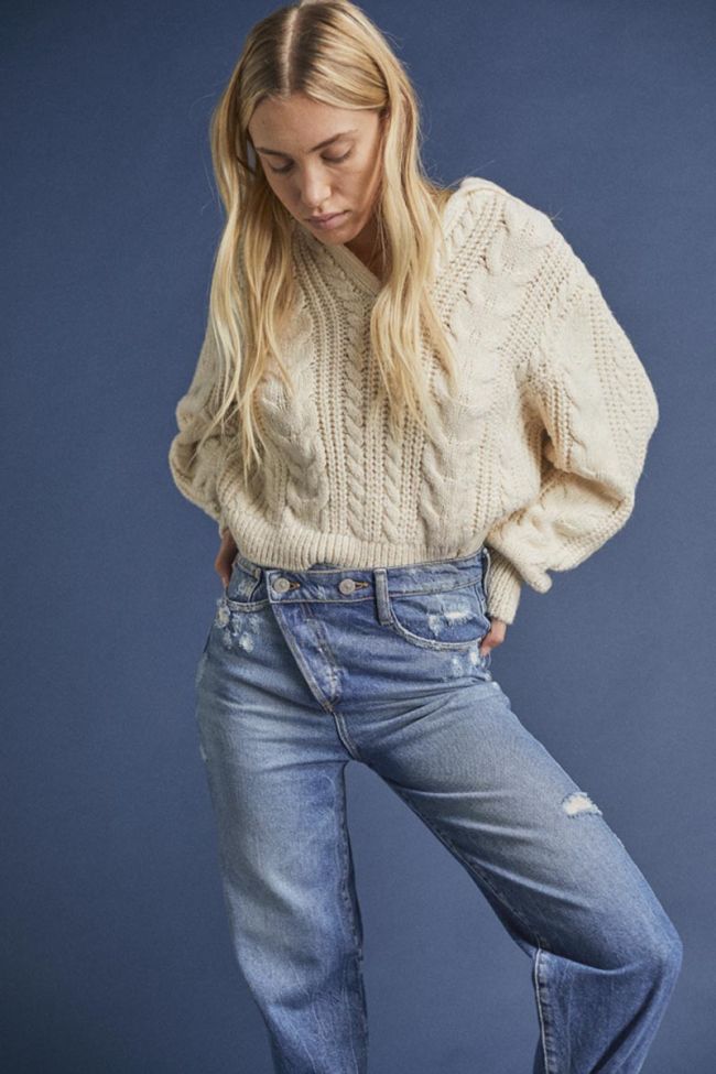 Jeans loose très tendance et original avec sa fermeture à boutons asymétrique, ses abrasions et ses trous réparés pour encore plus de style.