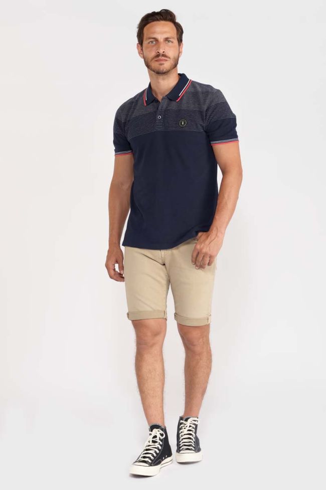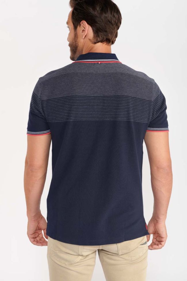 Ce polo Fabior bleu marine est très élégant avec ses fines surpiqûres blanches au niveau des épaules ainsi que ses bords côtes et son col avec liserés roses et blancs. Pour le détail, un écusson personnalisé "Le Temps des Cerises" au niveau de la poitrine et un mini liseré drapeau bleu, blanc, rouge au dos sous le col.