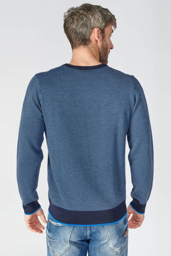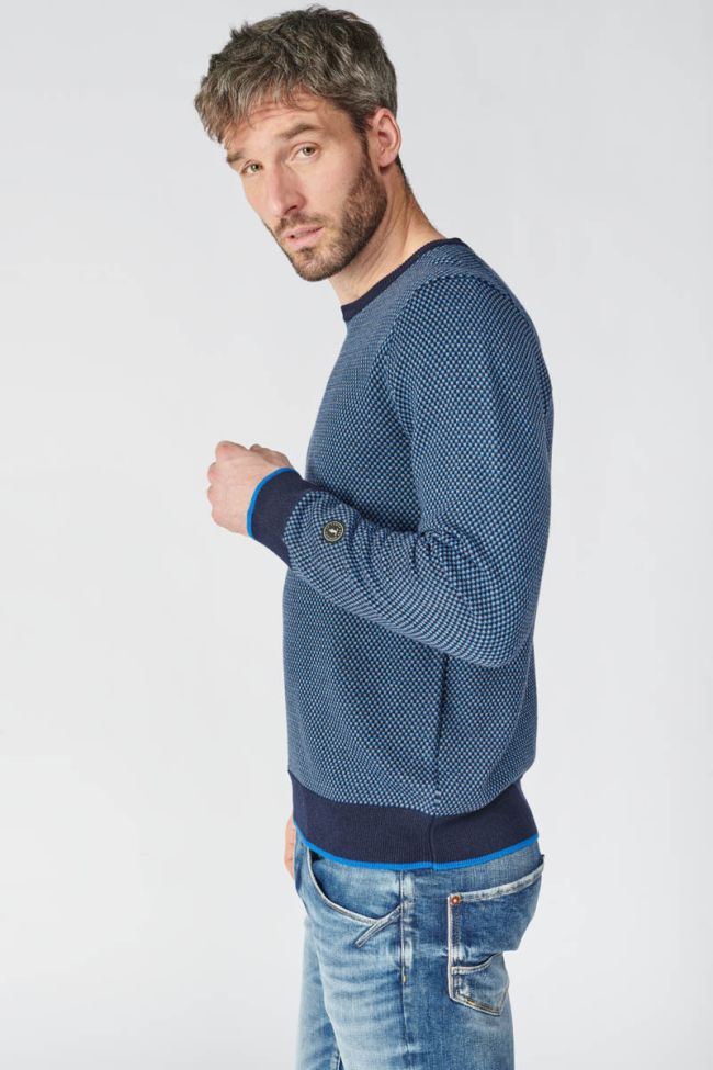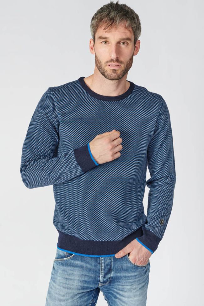 Ce pull Melest, à la matière douce agréable à porter, donnera à votre look une allure élégante avec son jacquard à motif bleu marine, gris et bleu vif, mais aussi tendance grâce à ses manches et son bas habillés d'un liseré bleu vif. Pour le détail, un écusson personnalisé Le Temps des Cerises sur le poignet gauche.