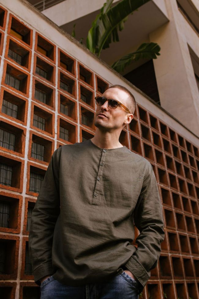 Chemise kaki en lin mélangé et au col tunisien.