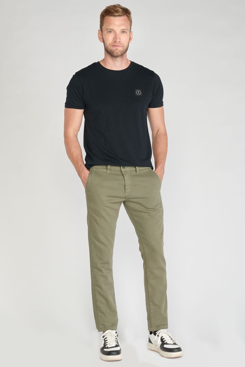 Le pantalon chino va à tous les hommes et permet d’adopter de nombreux styles.Pour un look chic, portez une chemise bleu clair, une ceinture en cuir, des mocassins, et un chino beige. C’est une tenue parfaite pour sortir ou pour célébrer un mariage avec style.Pour une allure casual élégante, osez la couleur avec un pantalon chino qui sort du lot ! Enfilez par exemple un pantalon chino bordeaux, un t-shirt blanc et une paire de baskets blanches.Pour adopter un style sportswear en chino, optez pour un chino kaki, un sweat à capuche, une paire de baskets tendance et colorée et une casquette. En hiver comme en été, le pantalon chino sadapte à toutes les saisons.Pour un look rebelle, associez votre chino avec une ceinture à chaine, un t-shirt rock, des boots, une veste en jean ou en cuir et un bonnet.Enfin, n’oubliez pas les accessoires pour donner du relief...