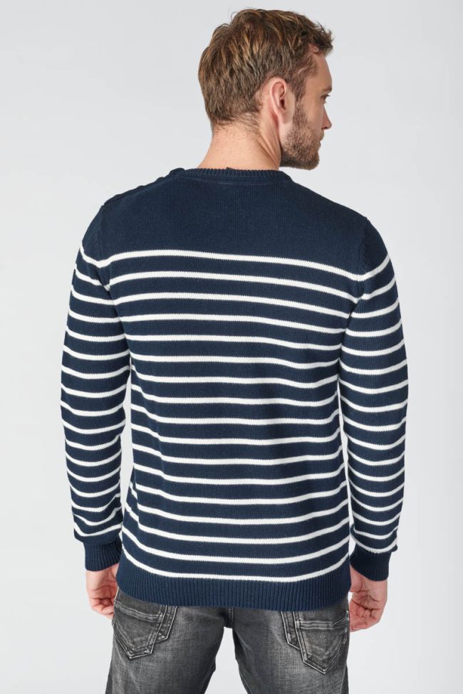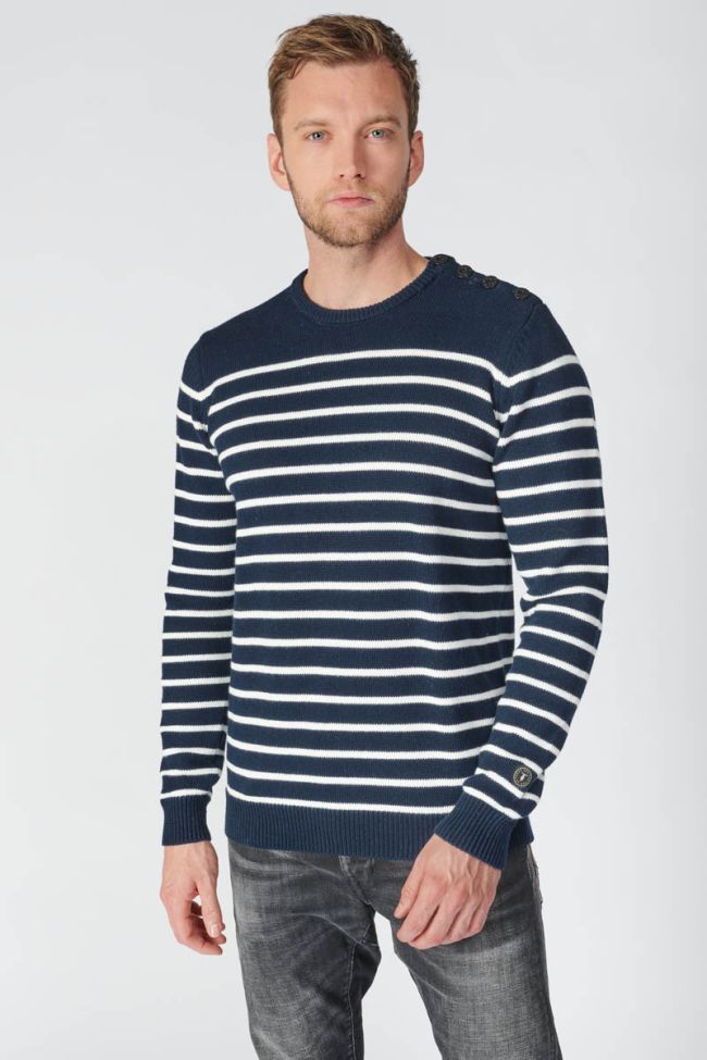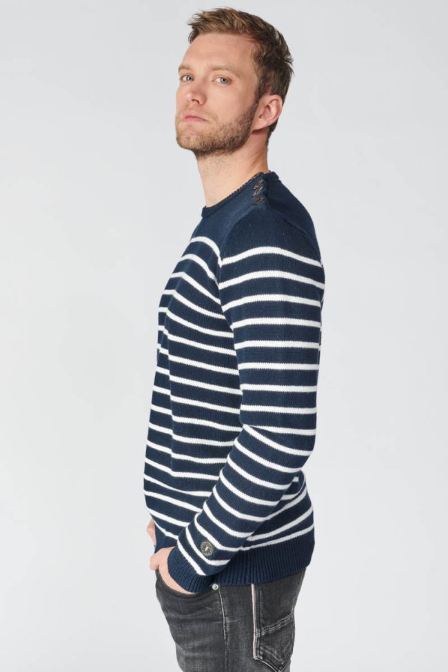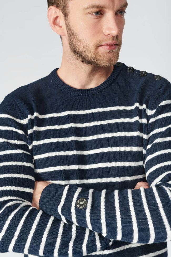 Ce pull Quest est un intemporel avec sa marinière bleu marine et blanche. Ses boutons noirs sur l'épaule gauche et son écusson au poignet gauche sont personnalisés Le Temps des Cerises et apportent plus de style à la pièce.