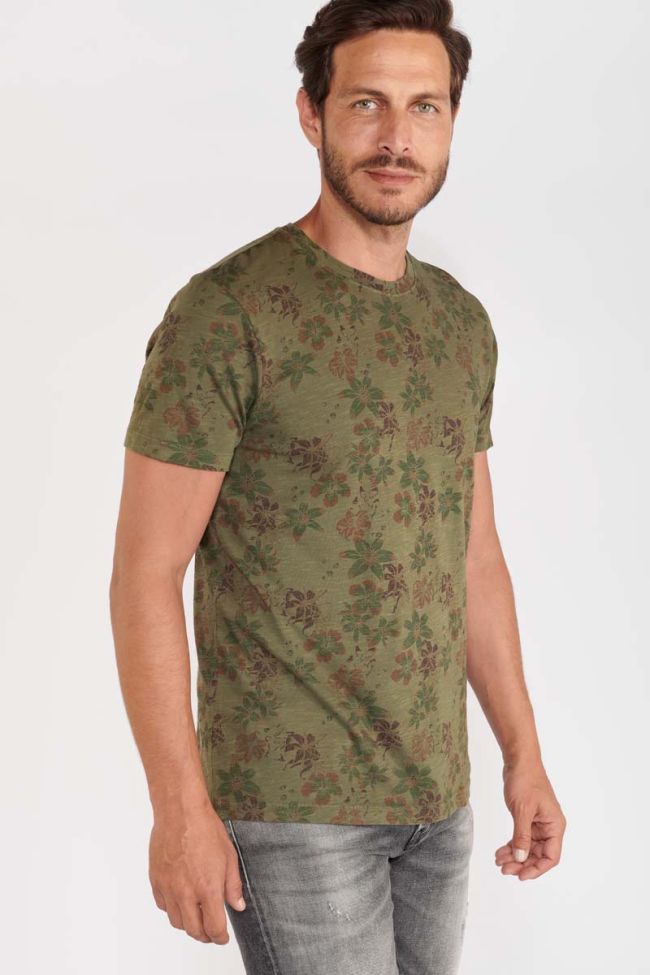Ce t-shirt Ribol kaki a un style casual avec son imprimé floral et son écusson personnalisé "Le Temps des Cerises" sur l'épaule gauche.
