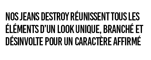 Nos jeans sont des pièces qui s'adaptent à toutes les situations . Que vous passiez un weekend à la campagne ou en bord mer, que vous ayez un rendez vous galant ou une réunion au bureau, le destroy sera toujours la solution idéale .