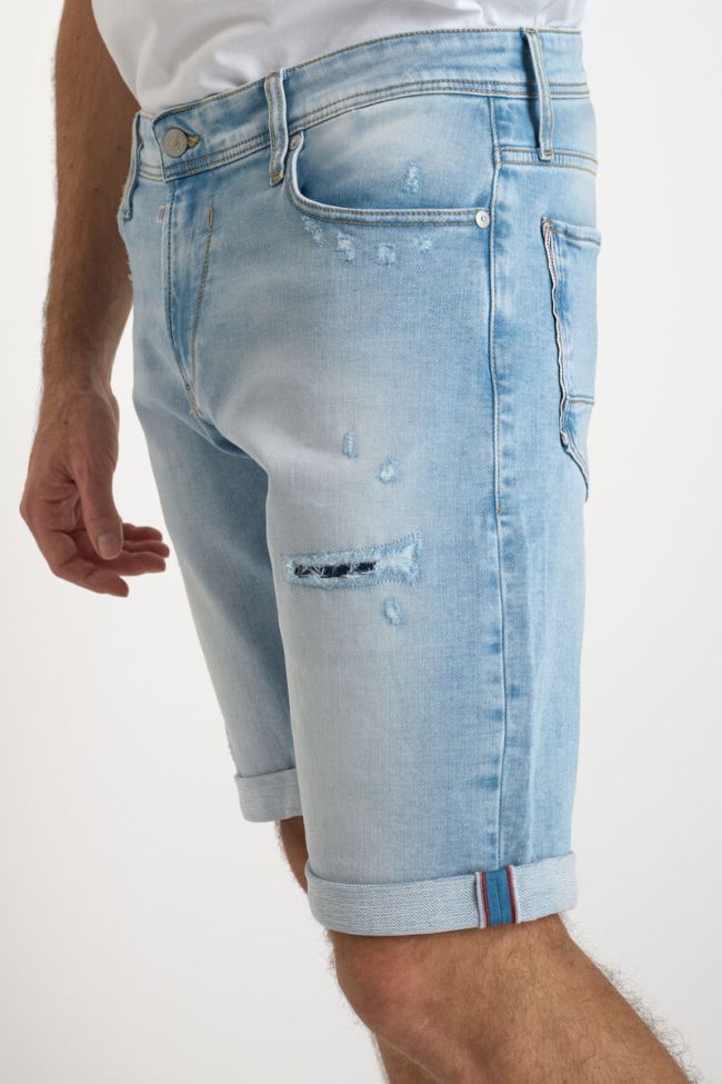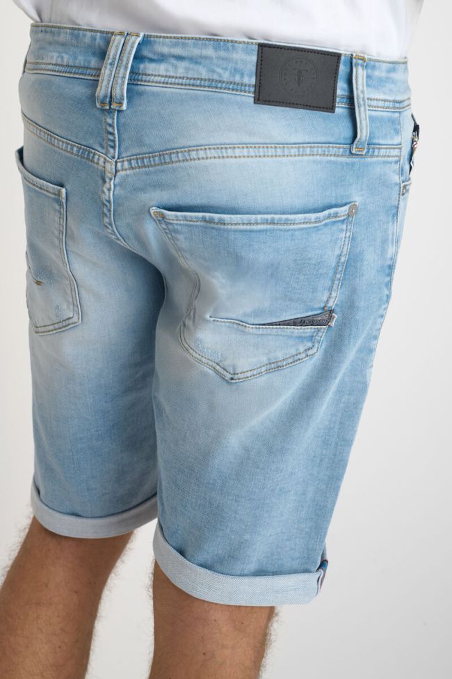Bermuda destroy à la toile stretch pour un confort optimal et au délavage bleu.