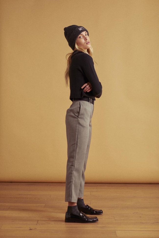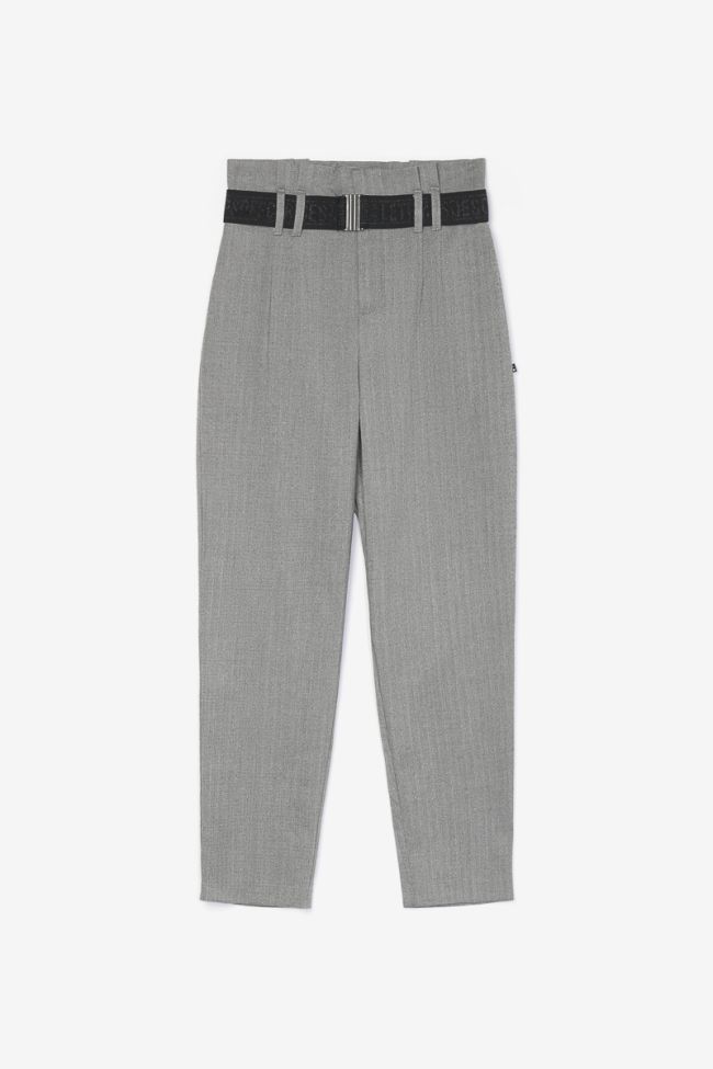 Pantalon cigarette taille haute à chevrons gris parsemé de fils brillants argentés et avec ceinture amovible noire élastiquée et personnalisée Le Temps des Cerises en fils brillants noirs.