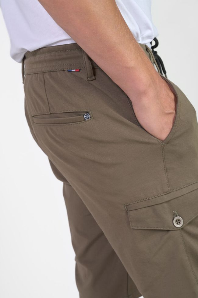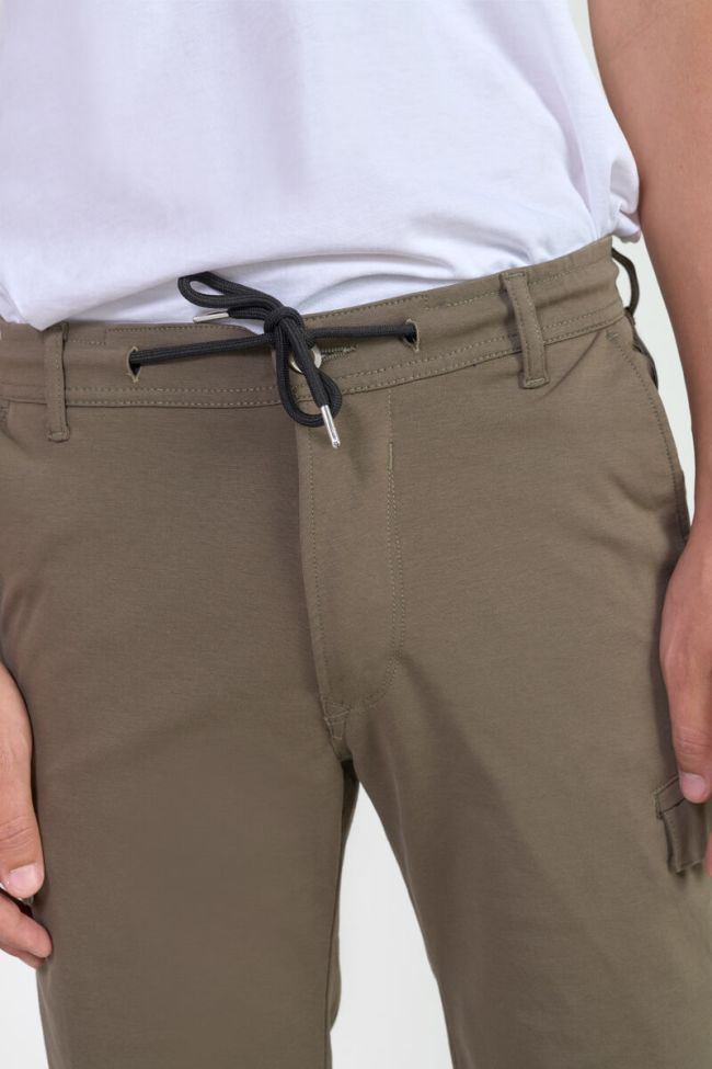 Bermuda kaki aux poches latérales et à la taille élastiquée à l'aide d'un cordon.
