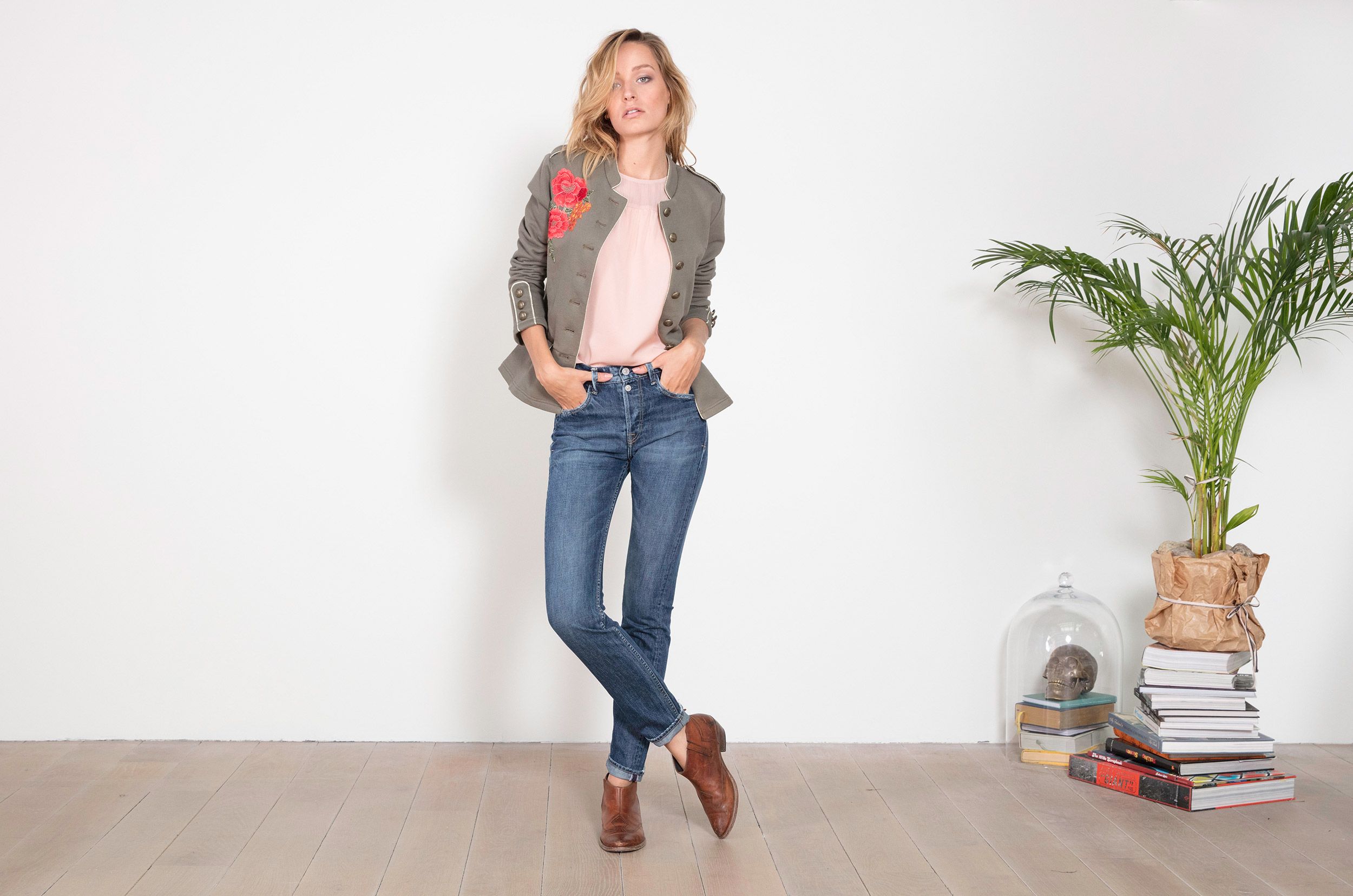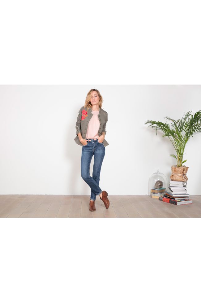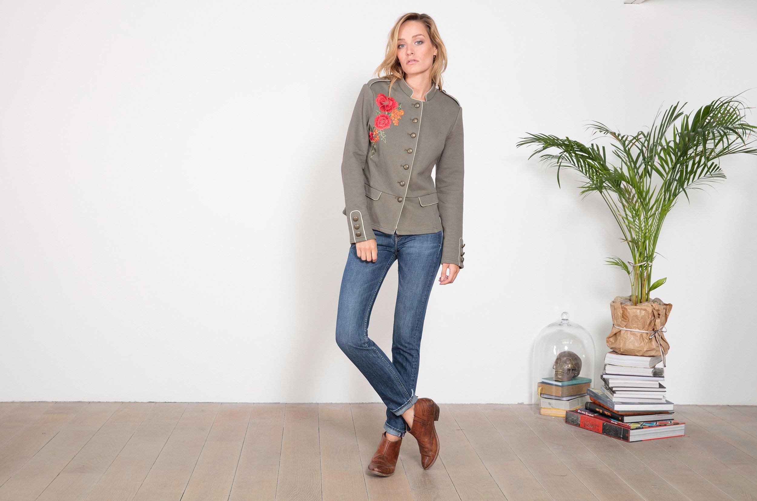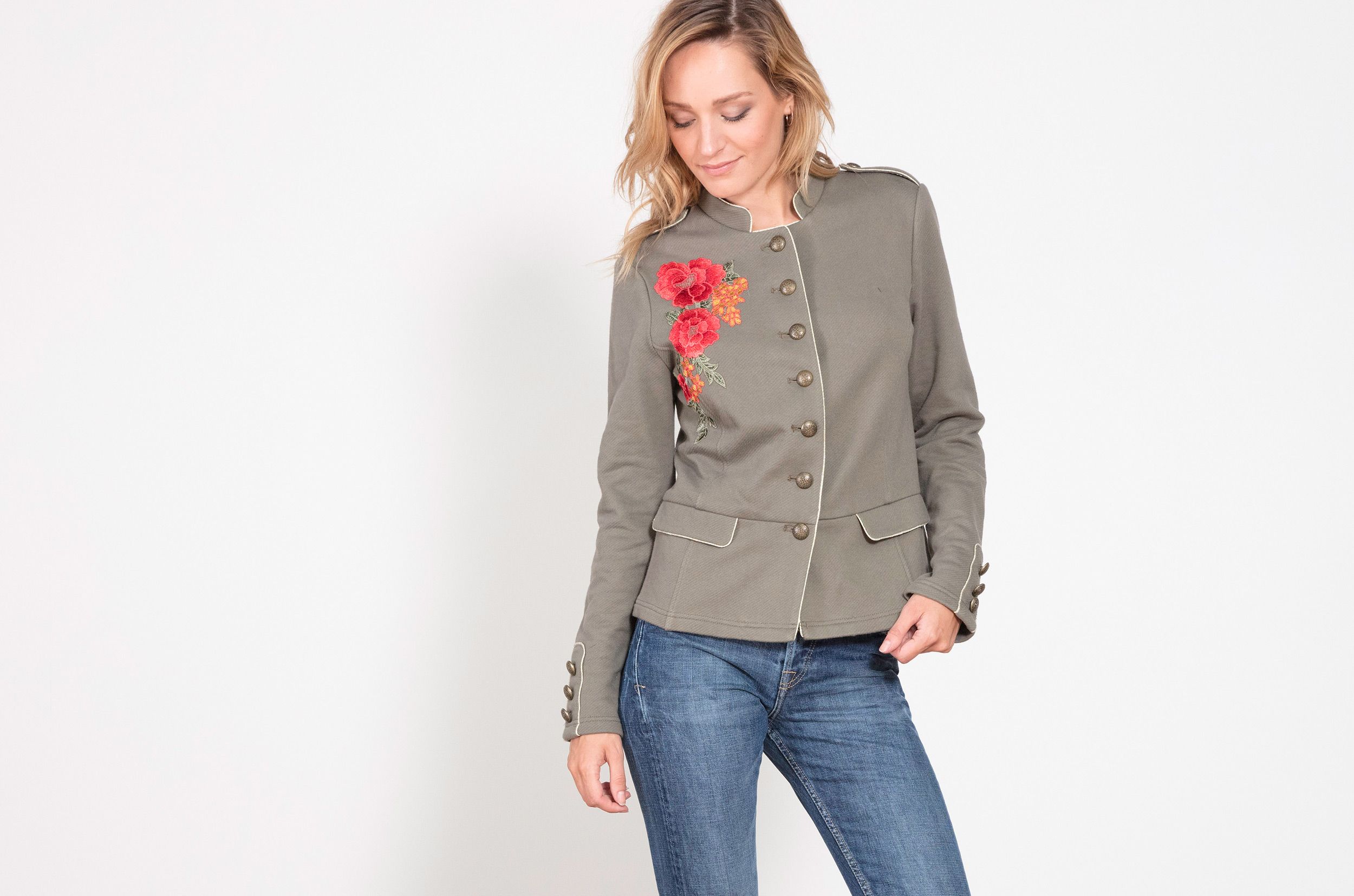 La veste blazer joue avec les codes en unissant son kaki militaire avec le romantisme de la broderie fleurie. Le résultat, tout en subtilité et féminité, finira de rendre votre look irrésistible.